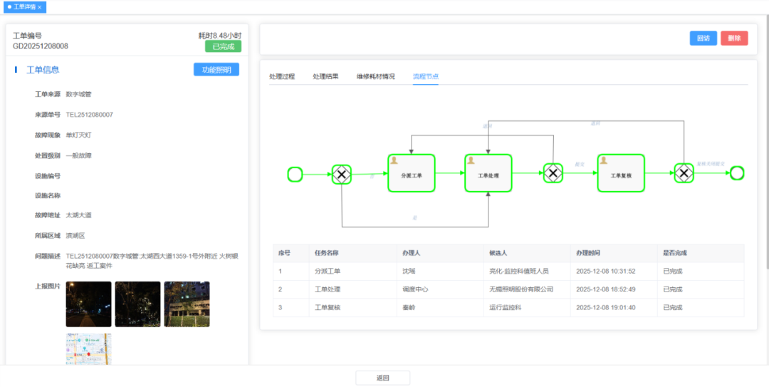 平台实现日常巡查、专项养护、考核管理等全场景维护管理的数字化管控,将分散的管养环节纳入统一智慧体系。运维系统与亮化控制系统深度互联互通,构建起全流程自动化管养机制:工单一键自动生成、处理进度实时可视、闭环管理全程追溯,彻底打通管养各环节壁垒。同时以数字化工具替代传统人工操作,将管理人员从重复性数据录入、报表整理等事务性工作中解放出来,聚焦管养策略优化、服务质量提升等核心任务,系统上线以来,累计自动生成工单超816张,人工录入工作量减少30%,通过规范管养流程、简化操作环节,让日常运维工作更高效、更规范,整体管养效率与管理水平显著提升。