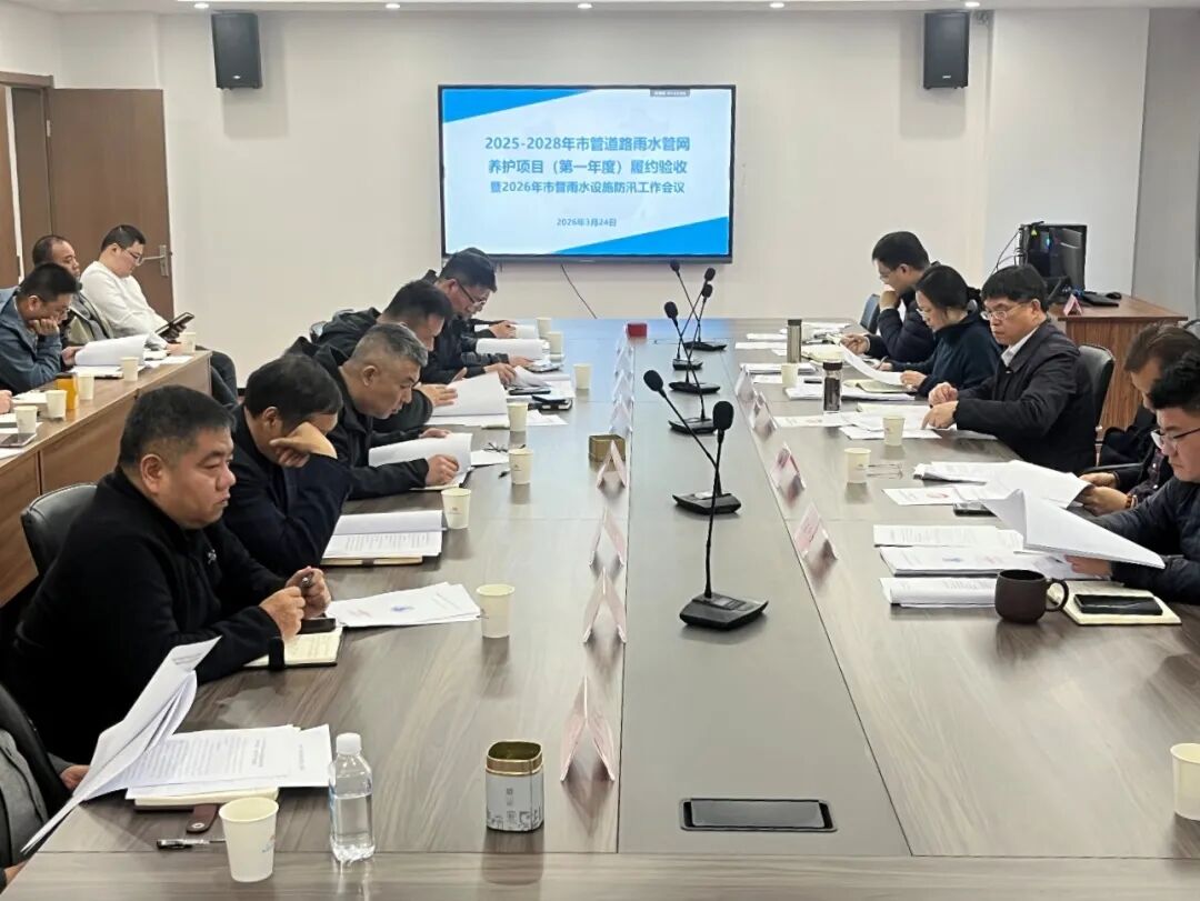 为检验市管道路雨水管网养护项目成效,部署2026年市管雨水设施防汛工作,进一步夯实排水防涝安全防线,3月24日,市照明和排水管理中心组织召开2025年度市管道路雨水管网养护项目履约验收暨2026年市管雨水设施防汛工作会议。市市政园林局副局长董保强、三级调研员张剑,市照明和排水管理中心分管负责人及相关科室人员参加会议。